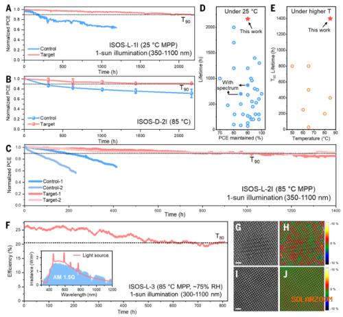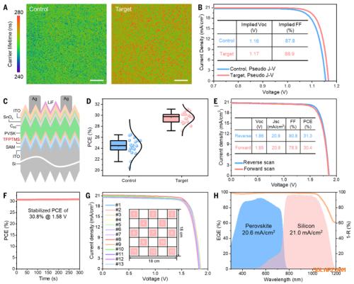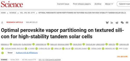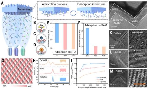钙钛矿-硅叠层太阳能电池的实验室效率已接近35%。然而,其商业化进程却面临两大挑战:不兼容性和不稳定性。传统的钙钛矿溶液加工工艺仍局限于定制纹理晶圆(亚微米级金字塔结构),这给可扩展、高通量生产带来了巨大障碍。同时,叠层结构中的宽带隙钙钛矿器件会加速退化,其使用寿命很少超过2000小时。克服这些瓶颈对于将创纪录的效率转化为持久耐用、可量产的技术至关重要。鉴于此,2025年12月18日新加坡国立大学侯毅于Science刊发在绒面硅上实现最佳钙钛矿蒸汽分配实现高稳定性叠层太阳能电池的研究成果,在绒面硅衬底上实现平衡的蒸汽分配是形成高质量钙钛矿薄膜并确保器件性能的先决条件。研究表明,有机物种(例如FA+)与金字塔形织构表面的相互作用较弱,导致吸附不足和相杂质的出现。为了克服这一限制,引入了一种双功能分子,该分子结合了三甲氧基硅烷锚定基团和富电子原子(例如氟),从而增强了有机物与衬底的结合,并在共蒸发过程中恢复了成分平衡。采用这种方法制备的器件在包括高温运行在内的严苛应力测试下表现出优异的稳定性。这种稳定性源于薄膜均匀性的提高,从而减轻了微应变,抑制了离子迁移和晶格畸变,同时减少了埋入界面处的残留PbI2杂质,限制了潜在的退化位点。这些协同效应赋予了叠层器件在严苛条件下长期稳定运行的能力。