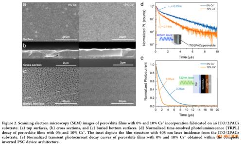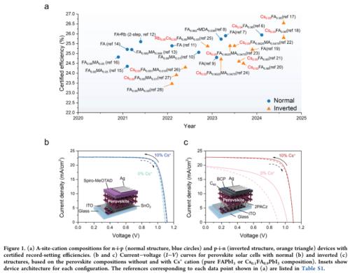 铯在倒置结构中关键作用:研究发现铯(Cs⁺)在倒置钙钛矿太阳能电池中能显著促进钙钛矿与空穴传输层之间的界面接触,而在正置结构中影响不大,揭示了结构依赖性的成分设计原则。