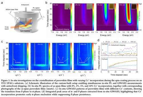 机理揭示与普适性:结合原位PL与GIWAXS等技术,阐明Cs⁺通过提高前驱液局部过饱和度、促进α相形成,其作用在不同HTL材料中均具有普适性,为倒置PSCs的成分优化提供了理论依据。