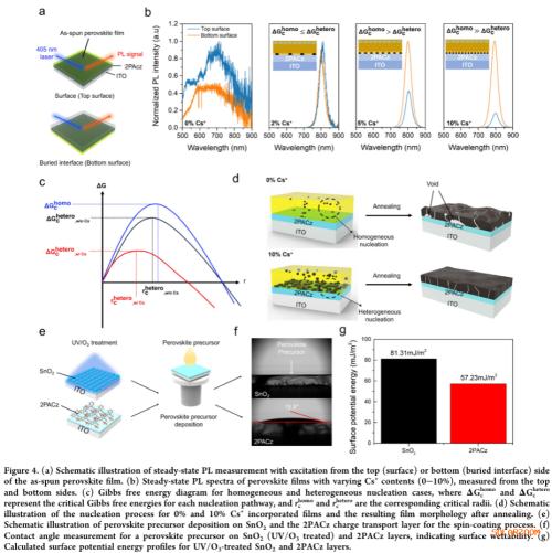 促进异相成核,减少界面缺陷:Cs⁺通过降低成核能垒,增强钙钛矿在疏水HTL表面的异相成核,有效减少界面空隙,提升电荷提取效率,从而改善器件性能。
