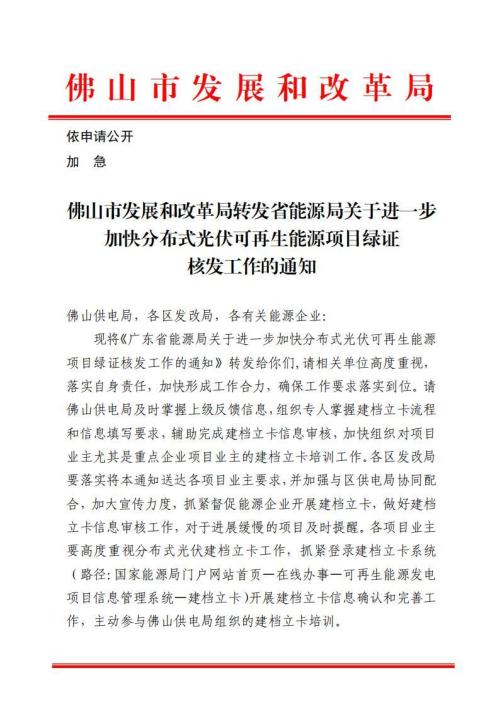 1.佛山市发展和改革局转发省能源局关于进一步加快分布式光伏可再生能源项目绿证核发工作的通知