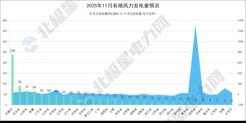 2025年11月,规上风力发电量排在前五的分别是:内蒙古238.6亿千瓦时、河北省90.3亿千瓦时、山西省67.4亿千瓦时、新疆65.7亿千瓦时、广东省50.2亿千瓦时。其中,内蒙古的风力发电量同比增长39%;河北省、山西省、新疆同比增长超40%。