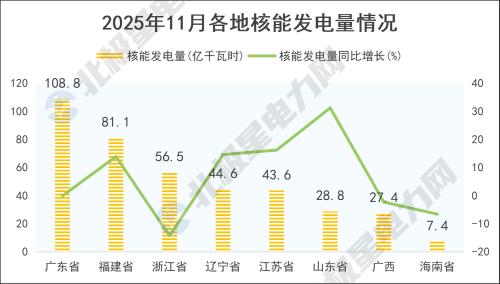 2025年11月,规上核能发电量排在前五的是:广东省108.8亿千瓦时、福建省81.1亿千瓦时、浙江省56.5亿千瓦时、辽宁省44.6亿千瓦时、江苏省43.6亿千瓦时。