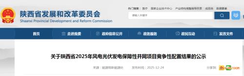12月24日,陕西省发改委发布《关于陕西省2025年风电光伏发电保障性并网项目竞争性配置结果的公示》。