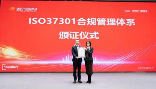 盐城2025年12月28日/美通社/ --近日,经过国际领先标准、测试及认证机构BSI的严格审核,通威太阳能科技盐城基地和南通基地获得由BSI颁发的ISO 37301合规管理体系认证证书。通过此次认证,标志着通威太阳能科技盐城基地和南通基地在合规管理领域正式与国际标准接轨,为企业全球化战略布局与高质量可持续运营筑牢了制度根基。