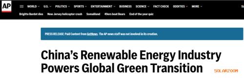美联社此前发文称,中国的光伏和风电产业取得了显著进步。2024年,中国可再生能源发电达到3500太瓦时,占总发电量的35%;风电和光伏发电总量达到1800太瓦时,占总发电量的19%。