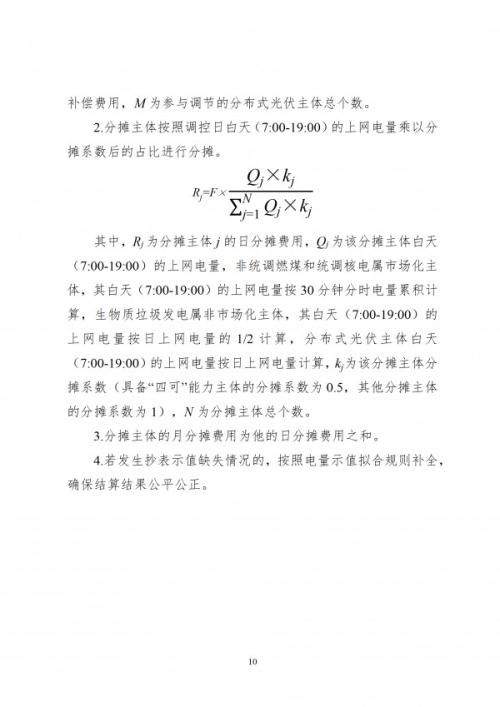 (六)明确分摊范围和机制。补偿资金由非统调燃煤、统调核电、生物质垃圾发电和分布式光伏发电主体(除自然人户用项目外)进行分摊。非统调燃煤、统调核电和生物质垃圾发电的最小调节基准值参照统调燃煤的最小技术出力标准设置为40%,在分布式光伏参与调节的时段内,非统调燃煤、统调核电和生物质垃圾发电实际最小出力超过最小调节基准值的,需参与分摊,分摊系数为1,鼓励项目通过建设电源侧储能提升调节能力。分布式光伏发电在调节时段的上网电量全额参与分摊,具备“四可”能力的分摊系数设置为0.5,不具备“四可”能力的分摊系数为1。各主体根据调节日白天(7:00-19:00)上网电量乘以分摊系数后的占比进行分摊。按照全网调节和局部电网调节情况,公平合理分摊费用。