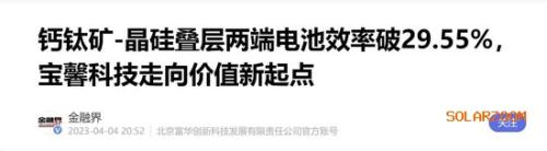 值得一提的是,当前钙钛矿叠层电池效率的世界纪录为33.7%,前不久隆基绿能(601012)也取得了33.5%的效率突破,位列第二。宝馨科技(002514)作为光伏领域的新秀,在短短不到2年的时间内,就在钙钛矿叠层电池领域取得了接近31%的效率,这无疑大大超出了市场的预期。