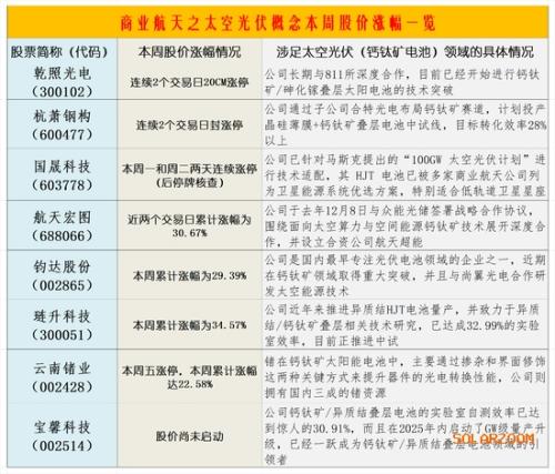 以下是商业航天之太空光伏概念相关品种本周股价的涨幅情况: