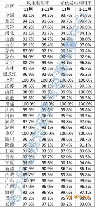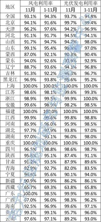 光伏方面,上海、浙江、福建、重庆四省市仍保持100%利用率。西藏1-11月利用率65.8%,11月单月利用率63.8%。除西藏外,甘肃、青海、新疆三省1-11月利用率也在90%以下。河北、蒙西、蒙东、陕西、宁夏、云南六地1-11月利用率在95%以下。