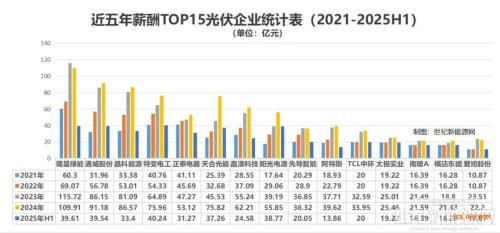 从薪酬支出规模来看,2021-2025H1.TOP15光伏企业共支出超过2854亿元薪酬。其中,隆基绿能累计支付薪酬达394.61亿元,稳居126家A股光伏上市企业首位。