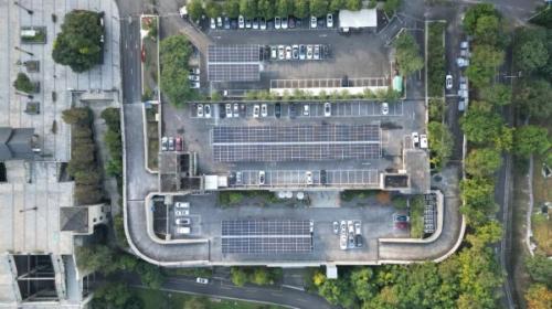 整齐排列的光伏板与建筑、停车场融为一体,在阳光下熠熠生辉,成为江阳区践行生态文明建设的一道独特绿色风景线。