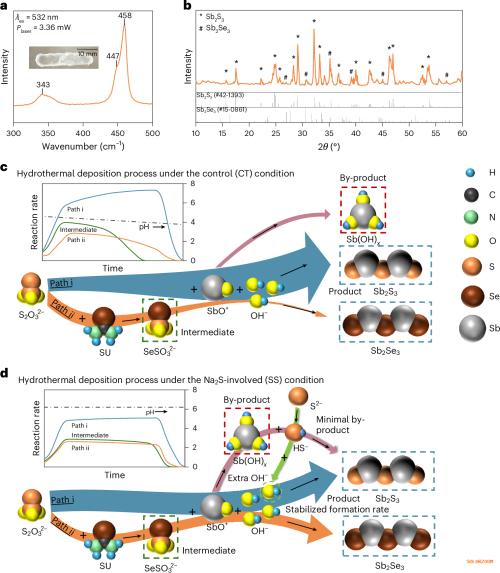 图1:水热反应原理。a,在STS与SU水热反应后,对反应溶液进行真空干燥所得残留物的拉曼光谱。位于343、447和458 cm-1的特征峰分别对应于SeSO32-的Se–S伸缩振动、S2O32-的S–S伸缩振动以及SO42-的v2模式(对称弯曲振动)。插图:样品外观。b,两步水热反应后所得沉淀物的X射线衍射(XRD)图谱。反应悬浊液经离心收集沉淀,并进行后续退火处理。衍射峰可分别索引为Sb2S3(PDF#42-1393)和Sb2Se3(PDF#15-0861)。c, d,控制条件(CT,c)和引入Na2S的SS条件(d)下水热合成主要反应路径的示意图。蓝色、橙色和粉紫色箭头分别表示三条随时间演化的主要反应路径,即路径i:Sb2S3的生成、路径ii:Sb2Se3的生成以及副产物生成路径。箭头宽度表示反应速率。中间体、产物和副产物分别以绿色、浅蓝色和红色方框标示。插图为对应的反应速率与pH随时间变化曲线,显示SS条件下的反应速率明显比CT条件更为平稳。