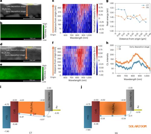 图3:横截面阴极发光(CL)光谱及能带边分布。a–c, CT样品横截面的扫描电子显微镜(SEM)图像(a)、阴极发光(CL)分布图(b)以及沿起始点方向(由橙色箭头标示)的CL光谱(c)。d–f, SS样品横截面的扫描电子显微镜(SEM)图像(d)、阴极发光(CL)分布图(e)以及沿起始点方向(由橙色箭头标示)的CL光谱(f)。其中,a和d中橙色箭头的起点定义为Origin(起始点)。超薄横截面样品均通过聚焦离子束(FIB)制备。在b和e中,图像亮度对应于选定带通波长窗口内的CL强度。不同深度处获得的光谱线型叠加于同一图中,以直观展示峰位随深度变化的行为,详见补充图7和8.c和f中出现的高能峰源自CdS层。g,由c和f中CL光谱提取的峰位能量。h, CT与SS样品在沉积早期阶段的CL光谱对比。i、j, CT(i)和SS(j)器件的能带边分布示意图。沉积早期的Sb2(S,Se)3薄膜通过将水热反应时间缩短至20 min制备,最终厚度约为20 nm。Sb2(S,Se)3的能带位置通过紫外光电子能谱(UPS)和UV–vis吸收光谱测定。蓝色带“+”号的圆点表示体内自由空穴,其需沿箭头方向传输并最终被Spiro-OMeTAD收集。ΔE表示在CT条件下由于价带顶(VBM)梯度引入的空穴传输能垒,该能垒在SS条件下消失。a.u.表示任意单位。