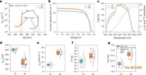 图5:载流子浓度与光电性能。a,由C–V测量得到的Mott–Schottky曲线,用于表征Sb2(S,Se)3体相中的有效载流子浓度,其在纵轴上以NCV表示。横轴中的Wd表示在所施加偏压下的耗尽区宽度。b、c, CT和SS器件的J–V曲线(b)及外量子效率(EQE)曲线(c)。d–g, CT(n = 9)和SS(n = 22)器件的开路电压(Voc)、短路电流密度(Jsc)、填充因子(FF)以及光电转换效率(PCE)的统计分布。d–g中箱线图的最小值、最大值、中位值、箱体边界、须线范围及分位数定义一致,具体说明见g图中的图例。