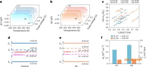 图4:缺陷表征。a、b,在脉冲电压为0.2 V、0.4 V和0.6 V条件下,CT样品(a)和SS样品(b)的O-DLTS信号。两个负峰(H1和H2)对应于Sb2(S,Se)3中的空穴陷阱(施主型缺陷)。c,由O-DLTS信号得到的Arrhenius作图,其中vth表示热速度。c图中的数据点通过对O-DLTS信号中包含的内部瞬态过程进行离散拉普拉斯变换计算获得,实线为对数据点的线性拟合结果。d、e,在脉冲电压为0.2 V条件下,CT和SS样品的能带结构及缺陷能级示意图。其中Ec、Ev和EF分别表示导带底(CBM)、价带顶(VBM)和费米能级。各能级均以对应的电子伏特(eV)数值标注。锥形阴影区域表示缺陷的俘获截面大小(开口宽度)及缺陷密度(延伸程度)。f,在脉冲电压为0.2 V条件下,H1和H2缺陷对应的缺陷密度NT及(σ × NT)的数值。为清晰展示相差一个至两个数量级的数据,右侧纵坐标轴采用了断轴处理。