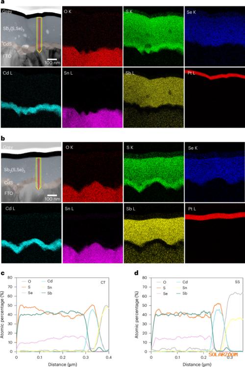 图2:元素分布。a、b, CT样品(a)和SS样品(b)的横截面TEM图像及对应的EDS元素分布图。c、d,沿a、b图中黄色箭头方向得到的CT样品(c)和SS样品(d)的原子百分比随深度变化的分布曲线。横截面样品通过聚焦离子束(FIB)制备,监测的元素包括O、S、Se、Cd、Sn和Sb。