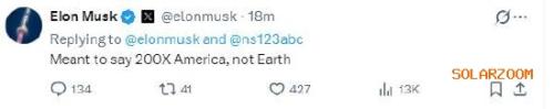 不过,马斯克稍后发帖更正了自己的一个口误:“我的本意是说‘美国的200倍’,而不是‘地球的200倍’。”