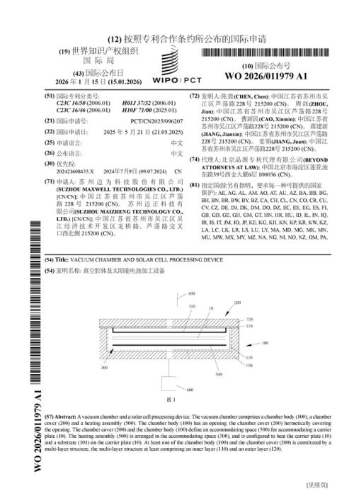 根据企查查数据显示迈为股份(300751)公布了一项国际专利申请,专利名为“真空腔体及太阳能电池加工设备”,专利申请号为PCT/CN2025/096207,国际公布日为2026年1月15日。