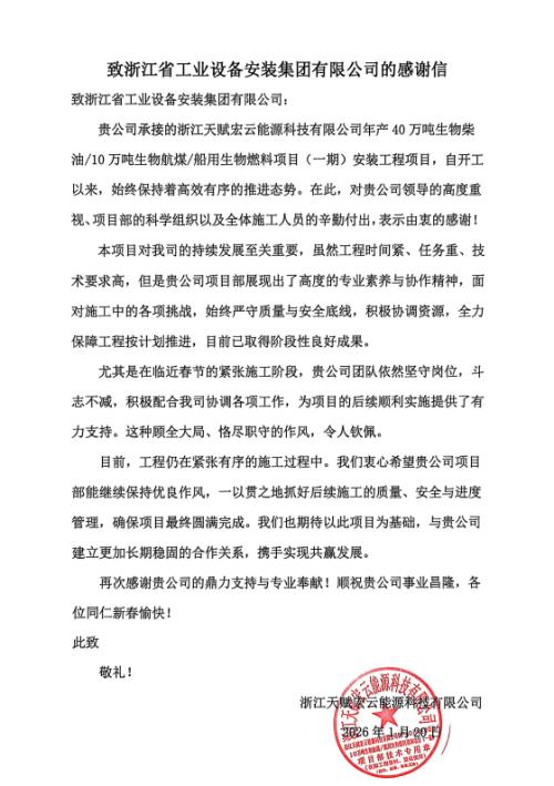 近日,浙江省工业设备安装集团有限公司第三分公司承建的浙江天赋宏云能源科技有限公司年产40万吨生物柴油/10万吨生物航煤/船用生物燃料项目(一期)安装工程项目收到业主单位发来的感谢信,信中对项目团队在工程建设中展现出的专业素养与协作精神给予高度认可。