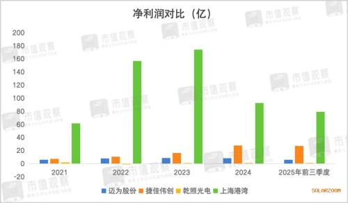 近年来,在光伏行业下行周期下三家盈利也出现了分化,捷佳伟创维持着中高速增长表现最佳,同时规模最大,这离不开其TOPCon设备市场份额领先以及多种技术路线的布局。而迈为股份自2023年后净利润陷入负增长,受行业影响较为明显。
