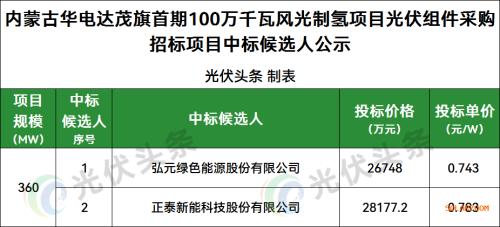 弘元绿色能源股份有限公司、正泰新能科技股份有限公司2家企业入围,投标单价0.743~0.783元/W。