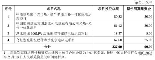本次发行的募集资金拟投资于中能建哈密“光(热)储”多能互补一体化绿电示范项目、中国能源建设集团浙江火电建设有限公司光热+光伏一体化项目、湖北应城300MW级压缩空气储能电站示范项目和乌兹别克斯坦巴什和赞克尔迪风电项目。