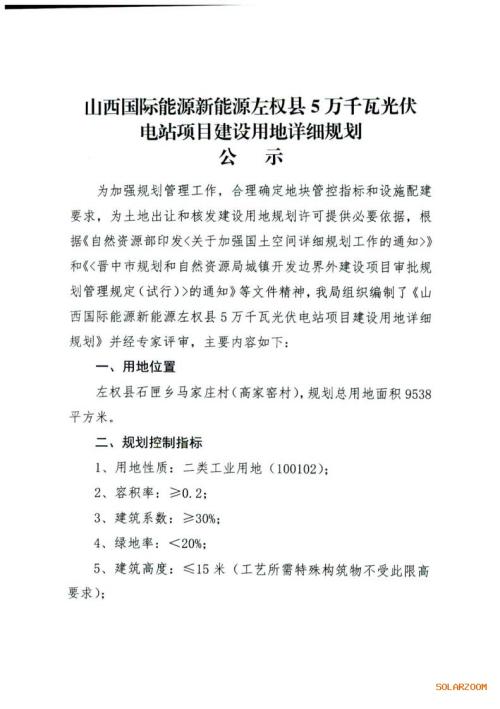 3月2日,山西省左权县人民政府公布山西国际能源新能源左权县5万千瓦光伏电站项目建设用地详细规划公示。
