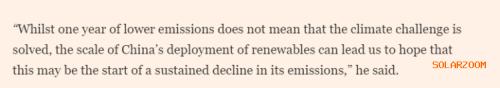 同时,文章称南安普顿大学的一位气候科学家表示,这些数据令人鼓舞,因为它们表明中国对绿色能源的大规模投资开始转化为可衡量的成果。“虽然一年的减排并不意味着气候挑战已经解决,但中国在可再生能源方面的大规模发展让我们有理由期待,这或许将是其排放量持续下降的开端。”