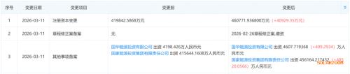 3月11日,国家能源集团新能源有限责任公司发生工商变更,注册资本由约42亿人民币增至约46.1亿人民币,增幅约10%。