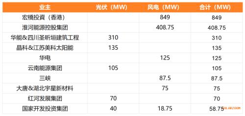 从业主方面来看,宏橋投資(香港)所获规模最大,共849MW。淮河能源控股集团其次,规模超400MW。华能、华电、云南能源集团、三峡等亦有所获。