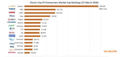 截至2026年3月下旬,中国光伏行业依旧保持强劲增长势头,发展稳健,以市值为核心的行业龙头格局已清晰显现。作为行业核心风向标,最新市值数据显示,阳光电源以约3386.6亿元的市值登顶榜首,这背后离不开逆变器与储能解决方案的崛起——如今这类产品已成为全球可再生能源转型进程中的关键支撑,也正是这一趋势,奠定了阳光电源的领先地位。