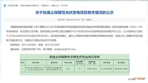3月30日,陕西安康市发布关于拟废止保障性光伏发电项目有关情况的公示,中电工程汉滨建民10万千瓦农光互补光伏发电项目被废止,控股企业系中国能建。