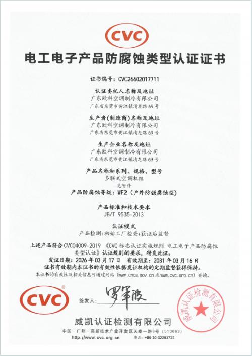 据全球液流电池网获悉,近日,EK工业多联机组通过行业权威机构腐蚀试验:二氧化硫气体腐蚀试验验证,正式获得F2(户内防强腐蚀型)防腐蚀认证证书和WF2(户外防强腐蚀型)防腐蚀认证证书,标志着EK工业空调突破技术壁垒,在高湿度、高盐雾、化学腐蚀这类恶劣环境的应用中更上一个台阶。