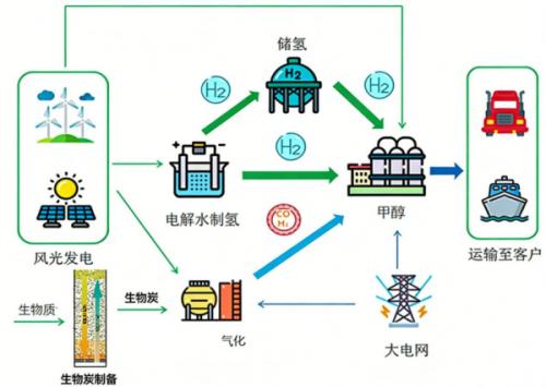 同时,项目年处理秸秆超百万吨,通过“生物质炭化-气化”技术将农业废弃物转化为合成气(CO+H₂)。该系统与绿氢供应端实时联动,通过变换工艺动态调节合成气氢碳比,当绿氢产量波动时,气化炉可动态调整生物质进料量,确保甲醇合成反应稳定进行。