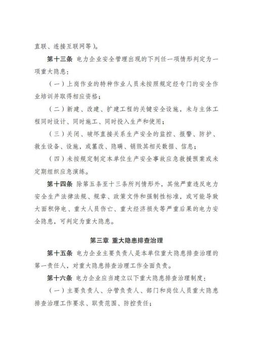 文件指出,本规定所称重大隐患是指电力企业因安全风险管控措施缺失、失效或者弱化,可能造成大面积停电、重大人员伤亡、重大经济损失等严重后果的人的不安全行为、物的不安全状态、作业场所或者作业环境的其他不安全因素和安全管理上的缺陷。