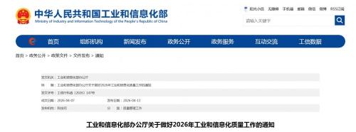 为贯彻落实中央经济工作会议精神和2026年《政府工作报告》部署,深入实施制造业卓越质量工程,体系化推进企业、产品、服务质量工作,加强质量技术创新,夯实质量技术基础,优化质量发展生态,促进一批企业质量管理能力升级,形成一批质量沿链传导行业样板,推动一批质量技术创新应用,培育一批质量公共服务载体,打造一批“中国制造”卓著品牌,为建设制造强国、质量强国、网络强国提供有力支撑。现就做好2026年工业和信息化质量工作通知如下: