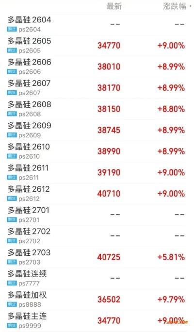 4月13日,多晶硅期货价格显著反弹,多个合约涨停。