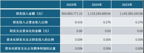 不过,有一点还是非常值得肯定的。2025年业绩不好,晶盛机电的研发投入倒是没有大幅度下降,仍有9.55亿元,占同期营收的8.41%。