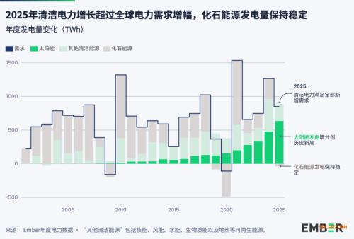 数据指出,自2015年以来,全球太阳能发电量已增长十倍以上,目前总发电量已相当于整个欧盟27国的电力需求。2025年,仅太阳能就满足了全球电力需求增量的75%,若加上风能,这一比例高达99%。在清洁电力的强力支撑下,全球化石燃料发电量微降0.2%,这是本世纪以来第五个化石燃料发电量未出现增长的年份。