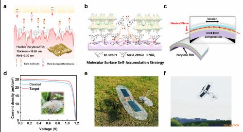 该研究提出一种分子表面自聚集策略,可缓解界面空穴传输的空间异质性问题,同时制备出结晶性能优异的钙钛矿薄膜。将Br-4PAPT分子掺入钙钛矿前驱体溶液,Br-4PAPT分子在钙钛矿结晶驱动下动态扩散并选择性聚集至钙钛矿薄膜的底部界面,与底部的MeO-2PACz协同作用,形成更完整的空穴传输通道。该策略使以聚对二甲苯(parylene)为柔性基底(9 μm)的超薄F-PSCs实现了24.47%的光电转换效率,在超薄柔性钙钛矿光伏领域达到国际先进水平。此外,研究团队还在聚萘二甲酸乙二醇酯(PEN)柔性基底上制备出5×5 cm2的柔性模组,该柔性模组在户外自然光照射下,成功为航模的短途飞行有效供电。结合力学中性面调控,柔性器件具备优异的机械稳定性,在2 mm弯曲半径下弯折循环10000次后,仍能保持初始光电转换效率的91.8%。