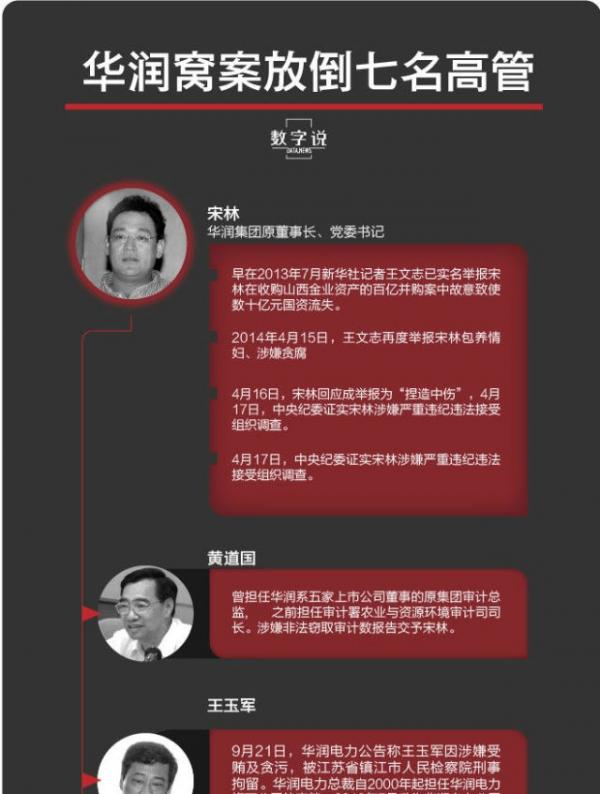 此后,华润集团原董事长宋林、华润集团原副董事长王帅廷、华润金融CEO吴丁、华润置地董事会副主席王宏琨,华润集团原审计总监黄道国等均陆续被带走调查。■