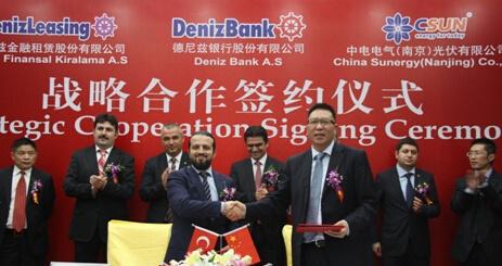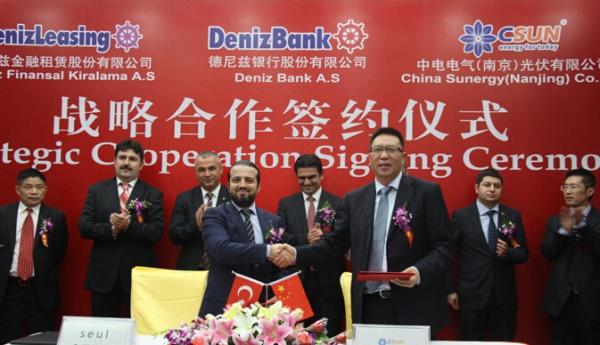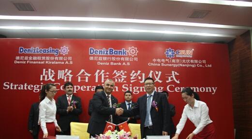 德尼兹银行在土耳其历史悠久、实力雄厚,是土耳其最大的金融服务集团之一。基于协议,德尼兹金融租赁股份有限公司将在土耳其境内,以融资租赁方式为使用中电光伏系统设备的太阳能项目提供融资,融资额度为100MW电站项目的组件。德尼兹金融租赁股份有限公司首席执行官卡赫拉曼先生说,战略合作不仅仅局限于融资,这次合作相当于“联姻”,双方将联手进行市场推广,提高中电光伏在土耳其当地市场的占有率。