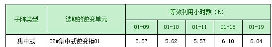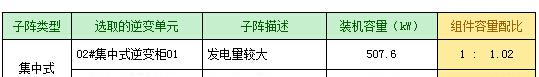 本次选取的集中式逆变单元为02#集中式逆变柜01,发电量较好,与组串式06#组串式子阵,为客观对比分析集中式子阵与组串式子阵的发电量,排除装机容量的影响,分析结果如下表所示: