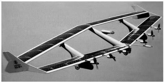 太阳能无人机的关键技术主要有两种,一是要有效地将太阳能收集起来,并高效地转换为电能;二是解决夜间和太阳光微弱时的能源供应。太阳能无人机主要在20~30km高空飞行,仍然是大气层内飞行。阳光虽然比地表强烈得多,但仍然受到大气影响,比外层空间弱得多。由于从地面起飞,阳光受到大气层的影响更大。要想在这种条件下收集太阳能,必须要有高效的太阳能电池。另外,无人机的爬升慢,只有100m/min,爬升到巡航高度通常需要3h。经过不断努力,加利福尼亚太阳能动力公司研制的太阳能电池有了很大进步,其功率提高了14%。将太阳能转化为飞机动力由电动机实现,使用的是无电刷电动机,每个重5kg,在地面上的转速为200r/min;而在最大高度时增加到2000r/min。为保证无人机高空飞行的可靠性,采用了固定式螺旋桨。