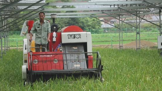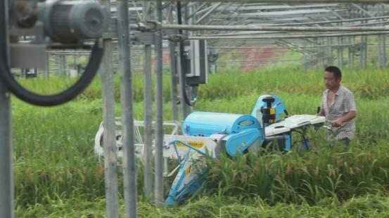 就在光伏水稻收割现场,三台收割机在《在希望的田野上》的音乐声中,大型收割机操作人员在光伏板下轻松自如操作收割机进行水稻收割,一棵棵水稻颗粒归仓,也印证了现场与会嘉宾以及同景新能源人,对农业与光伏电站有效结合从希望变为现实的喜悦。