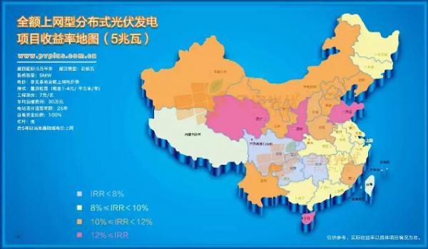 也就是说,在绝大部分地区,如果您投资建设了一个只有1MW的全额上网型分布式光伏发电项目,收益率都在8%~11%之间,比5MW项目收益率低1个百分点左右。但是它极其稳定的20年不变收益率,相比其他投资标的,还是非常值得考虑的!