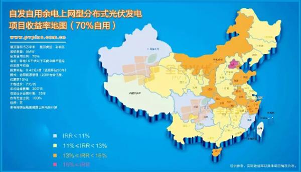 如图可知,如果在橘红和深粉色省份或地市投资建设一个5兆瓦的100%自发自用型分布式光伏发电项目,收益率会高达15%以上!而且是稳稳20年不变的稳定现金流收益!这种项目,此时不抢更待何时?