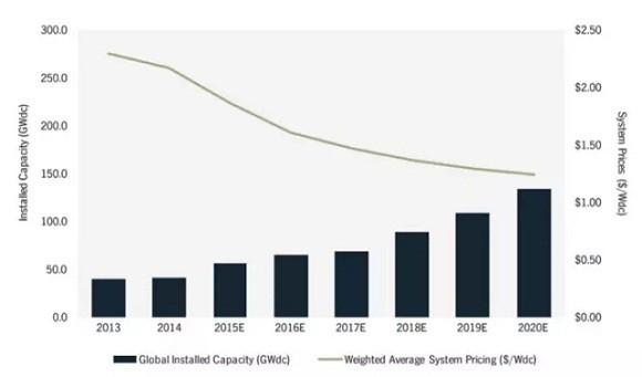 光伏板价格在2015年中继续稳步下行。据GTMResearch的测算,固定支架大规模光伏系统成本的价格仅在第二季度就从1.58降至1.49美元/W。预计该成本趋势仍将延续下行,2020年,全球市场新增光伏装机量将达到135GW。(2015年新增的55GW就足以供应加州的1000万家庭)如此增长趋势下,光伏将占到此期间每年新增电力装机容量的一半。