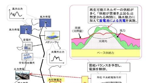 设置的大容量蓄电池并入电网,将作以下验证:(1)接受东北电力中央供电调度局指令控制充放电,验证因可再生能源输出导致的供应过剩与需求的平衡改善效果;(2)运用蓄电池系统的无功功率控制,验证随可再生能源输出变动的本地网电压变动抑制效果等。